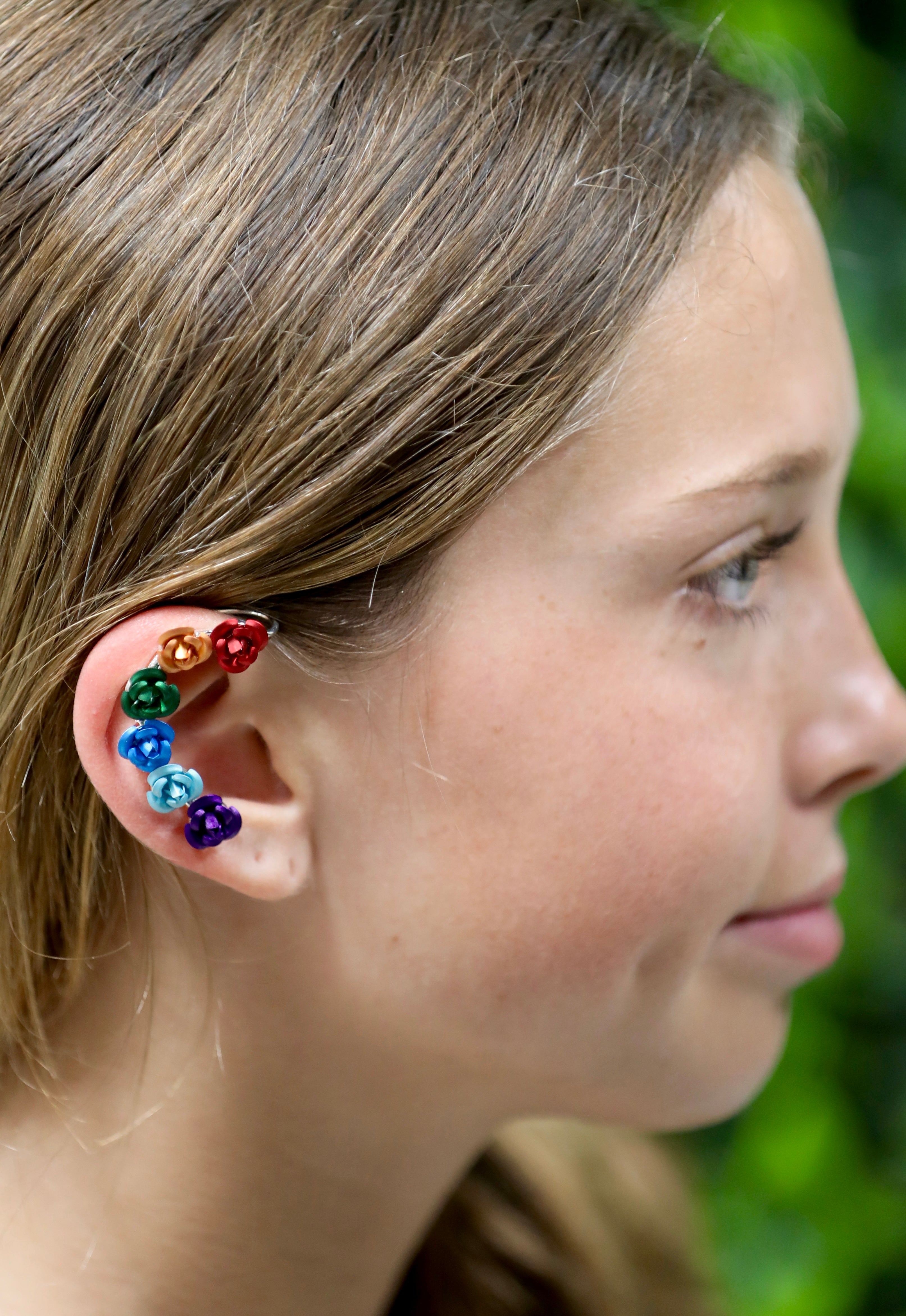 Elevate your style with the Elf Cuff Small Rose in a stunning gold and red floral design. Inspired by nature's beauty, these delicate ear cuffs feature intricately crafted roses on a lightweight, curved gold frame for a comfortable, no-piercing-required fit. Perfect for any occasion, this adjustable accessory ensures both elegance and ease, making it an ideal choice for all-day wear. Customize your look by selecting your preferred side for color placement in your order notes.